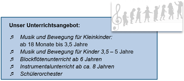 Unser Unterrichtsangebot: Musik und Bewegung für Kleinkinder: ab 18 Monate bis 3,5 Jahre Musik und Bewegung für Kinder 3,5 – 5 Jahre Blockflötenunterricht ab 6